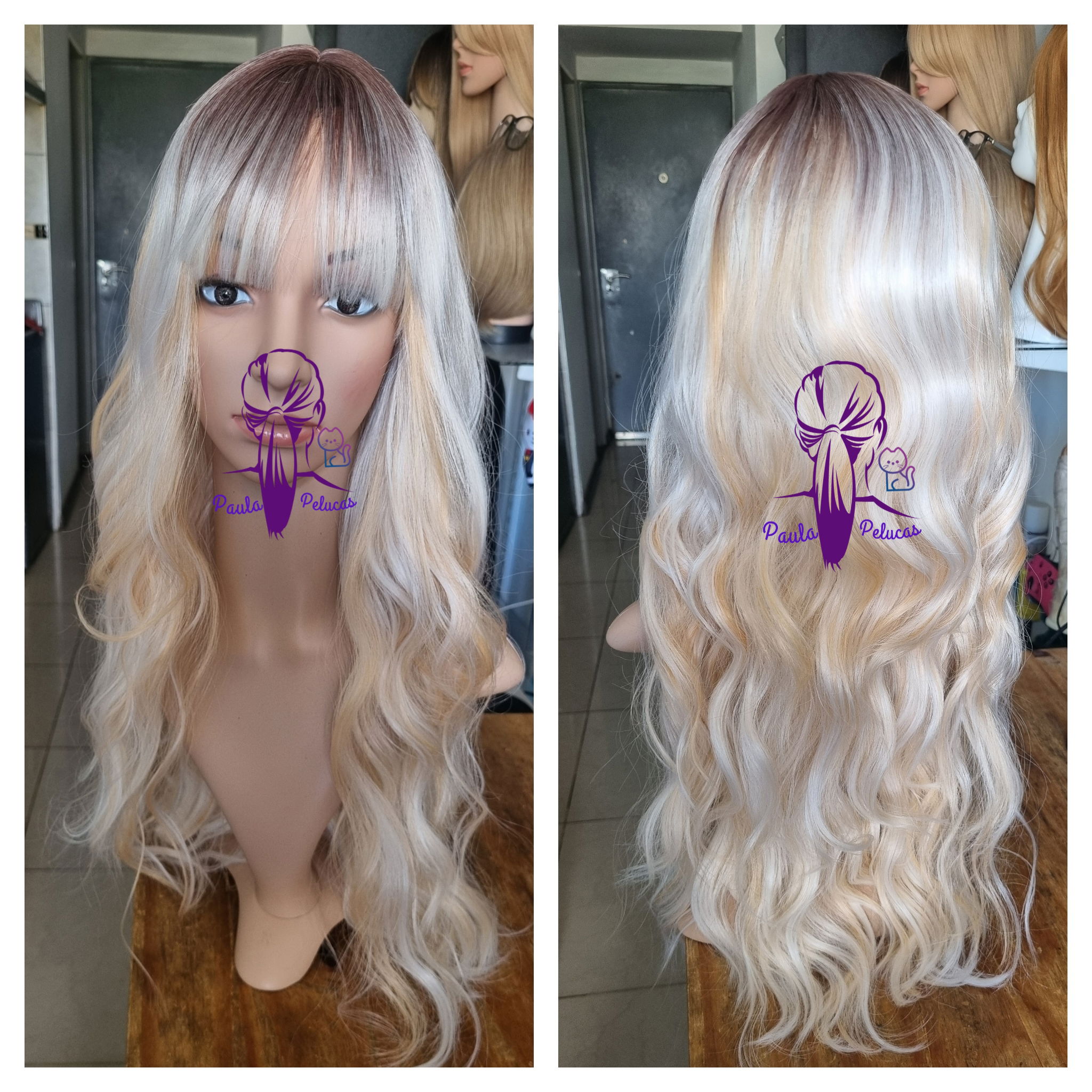 Fibra sintética kanekalon , tono castaño claro en la raiz dedegrade a rubio platino con reflejos rubio miel .