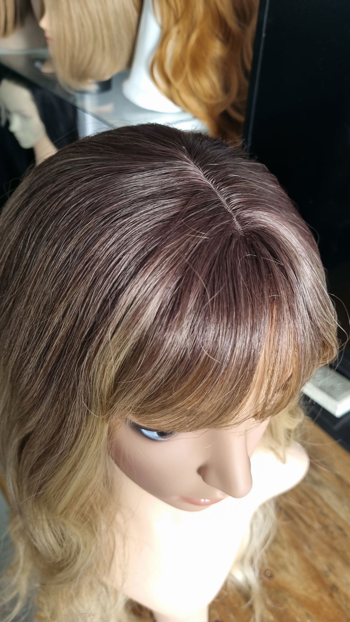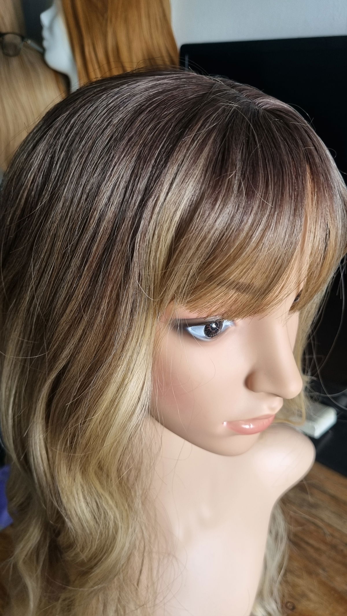 Fibra sintética kanekalon , tono castaño claro degrade mix de rubios claros a oscuros .