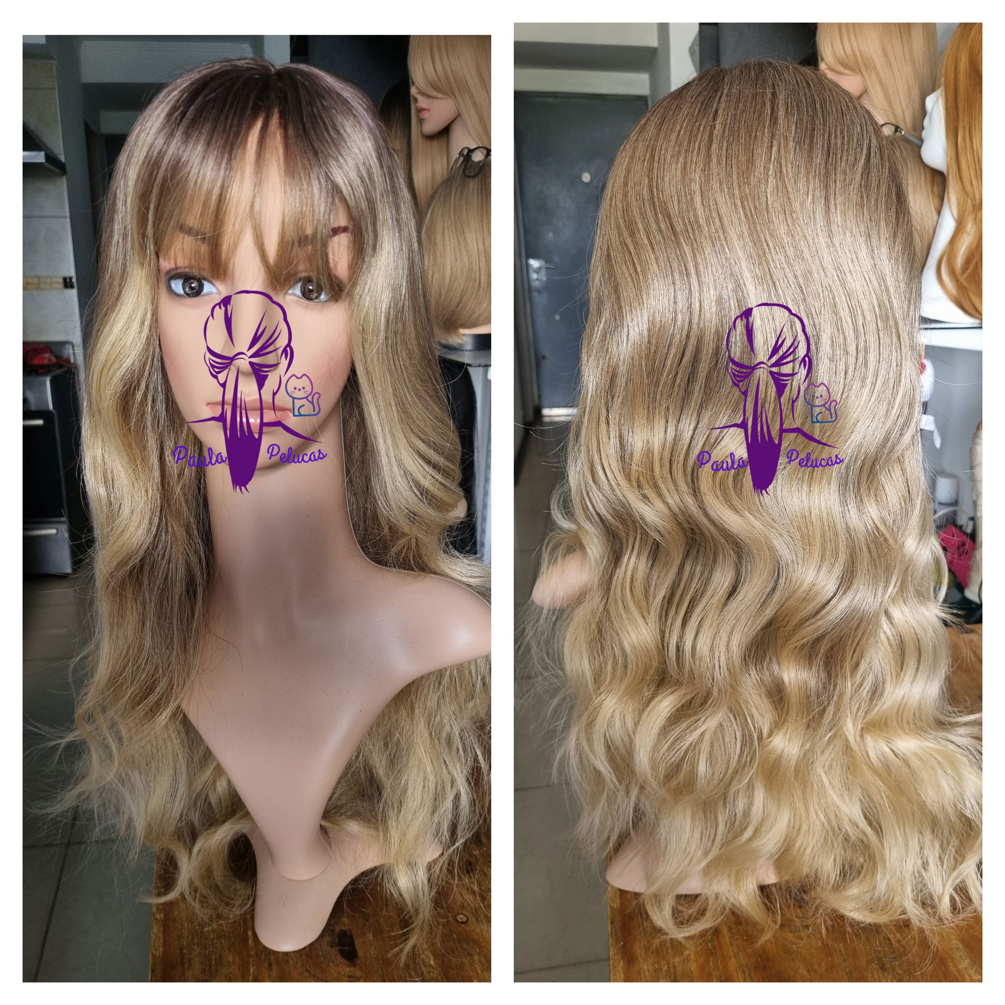 Fibra sintética kanekalon , tono castaño claro degrade mix de rubios claros a oscuros .