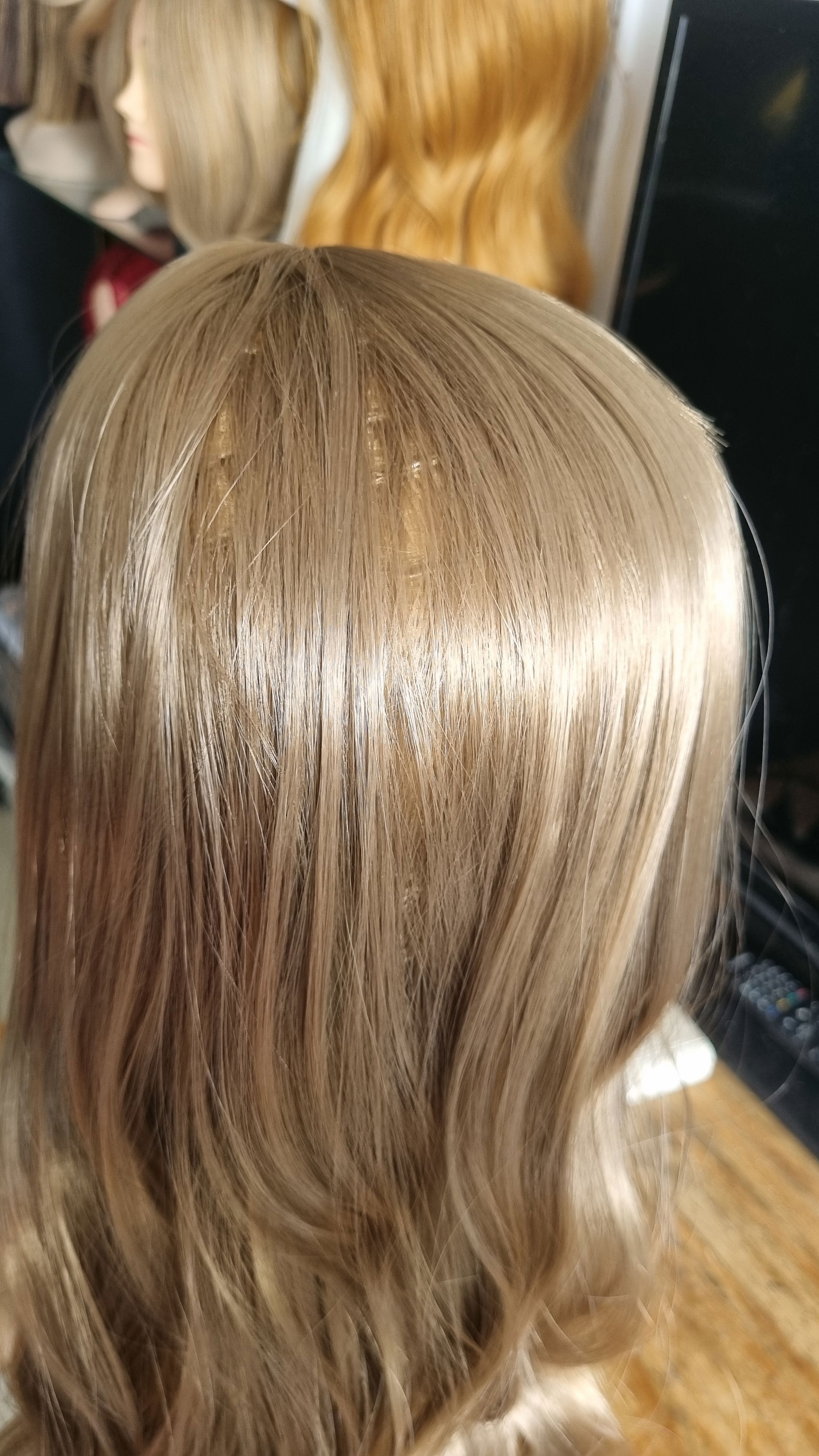 Medida de 60cm , sin flequillo , tono rubio ceniza , red simple .