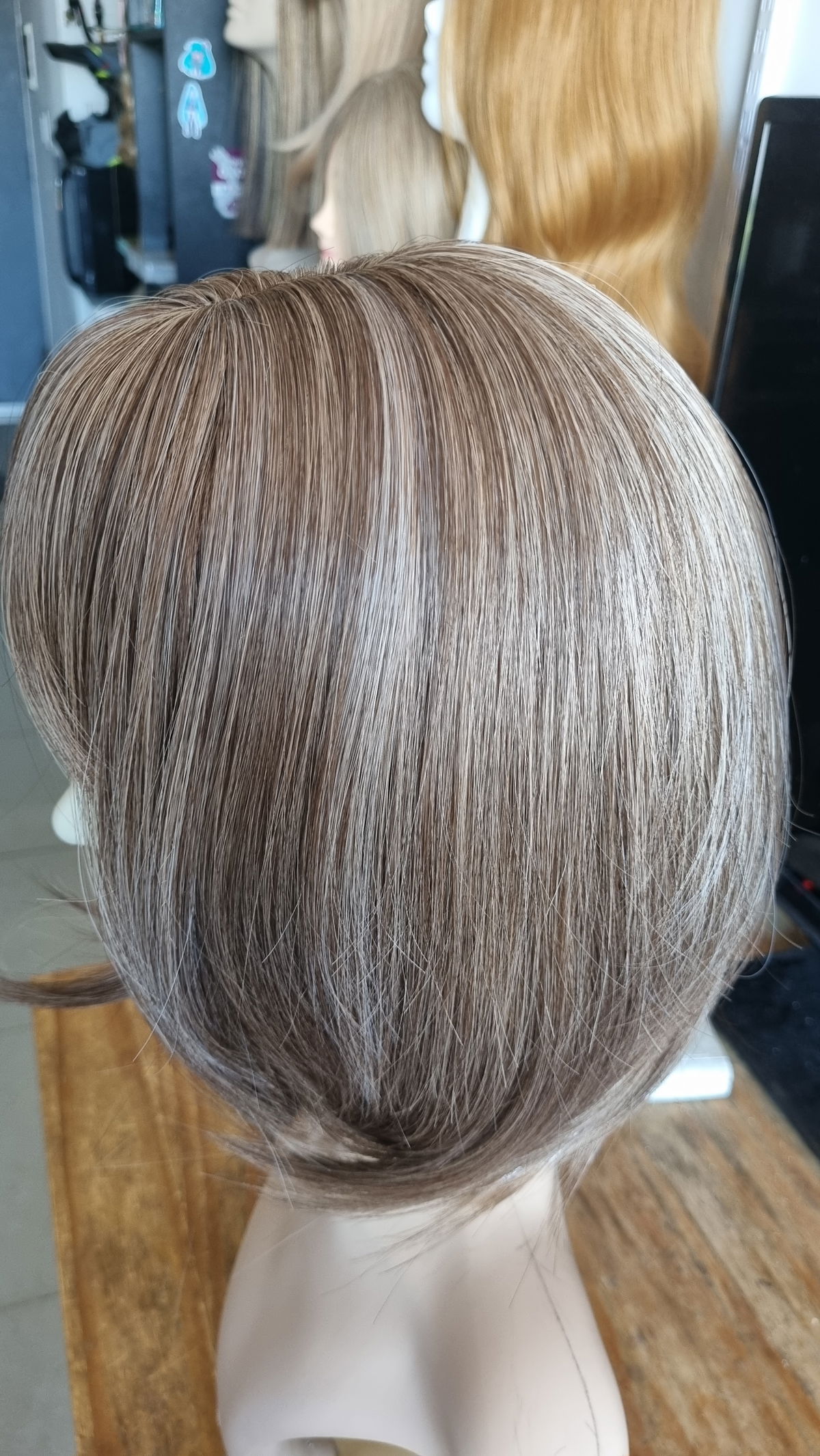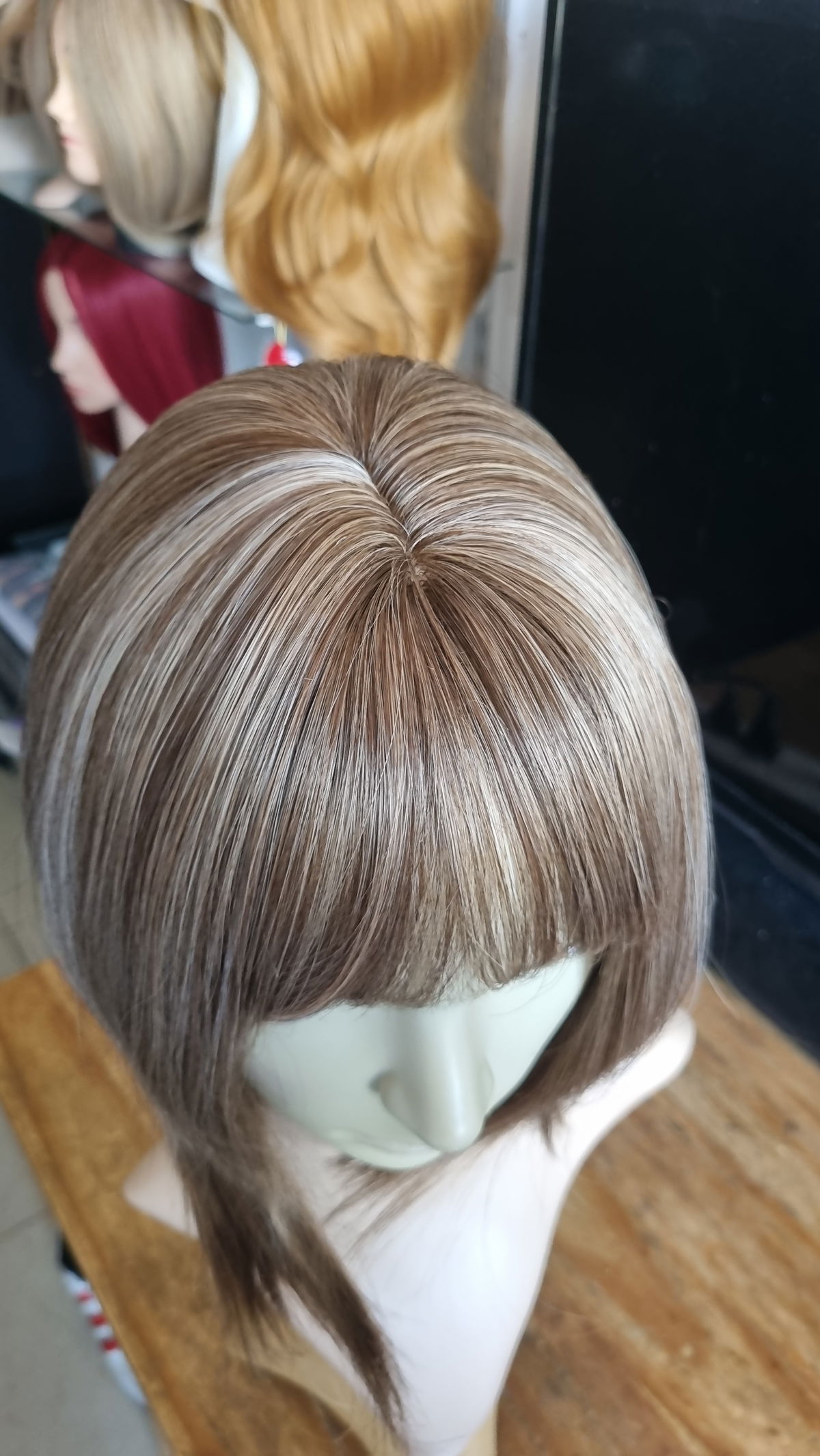 Fibra sintética kanekalon , tono castaño claro con reflejos sutiles en rubios mas claros a oscuros .