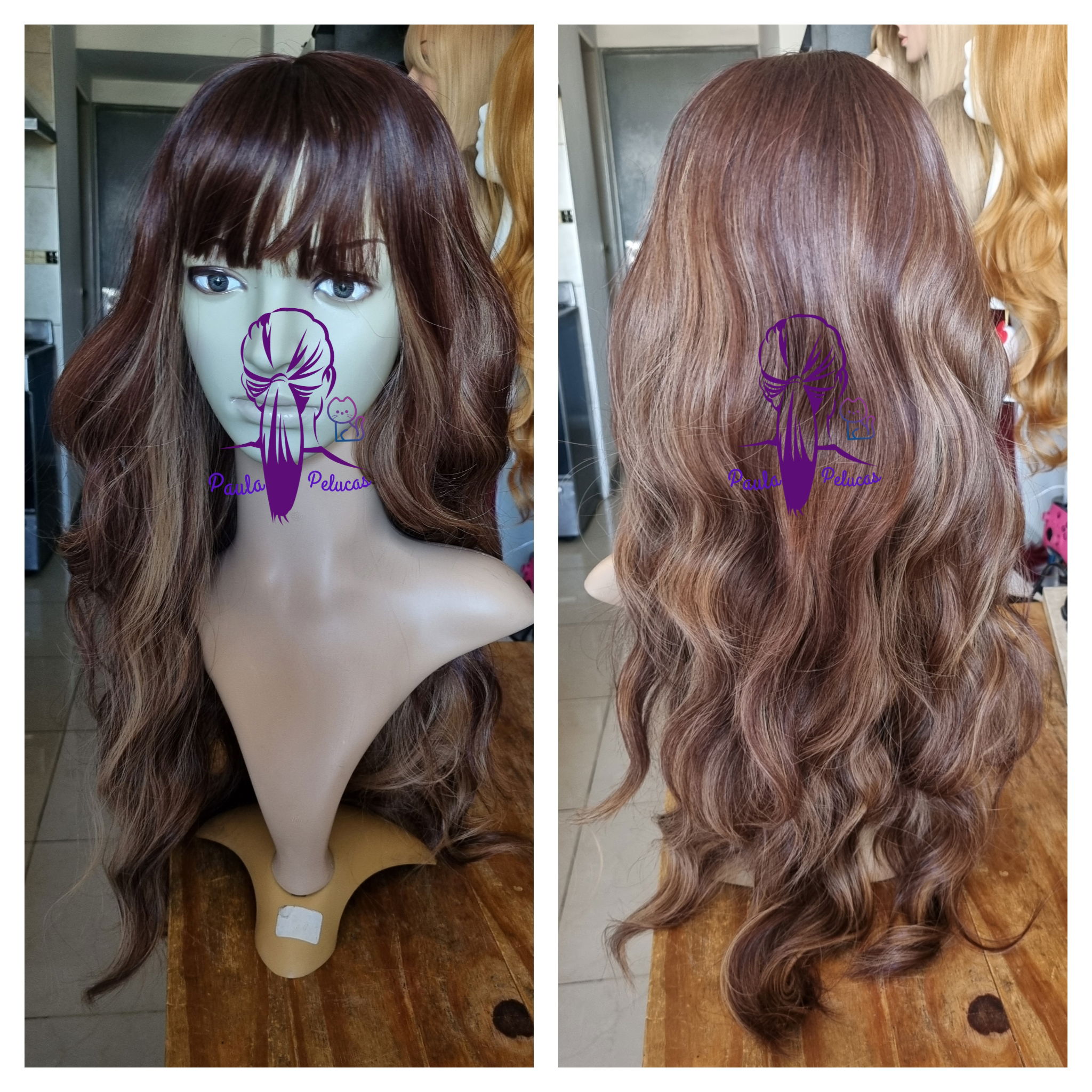 Fibra sintética kanekalon , tono castaño oscuro degrade castaño rojizo con reflejos rubios .