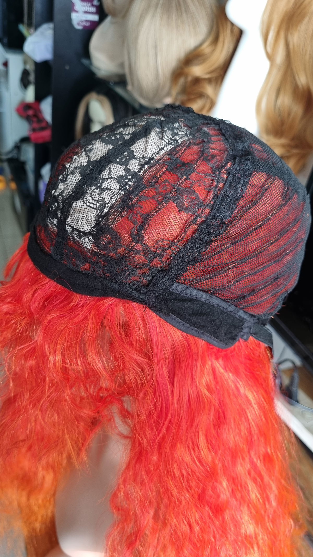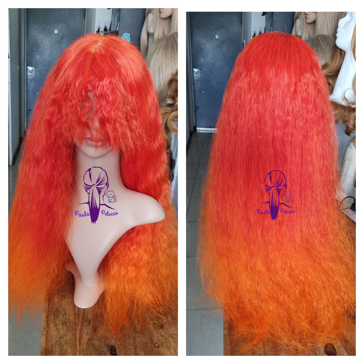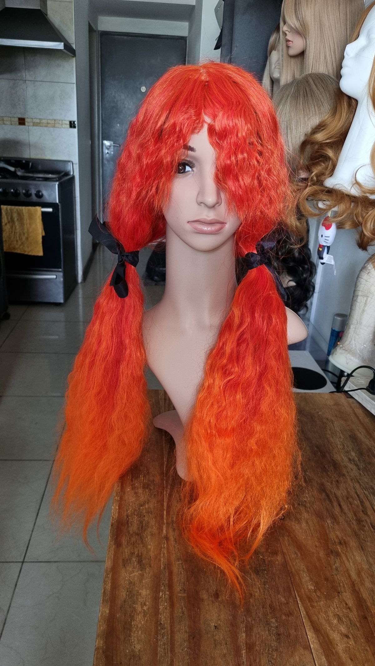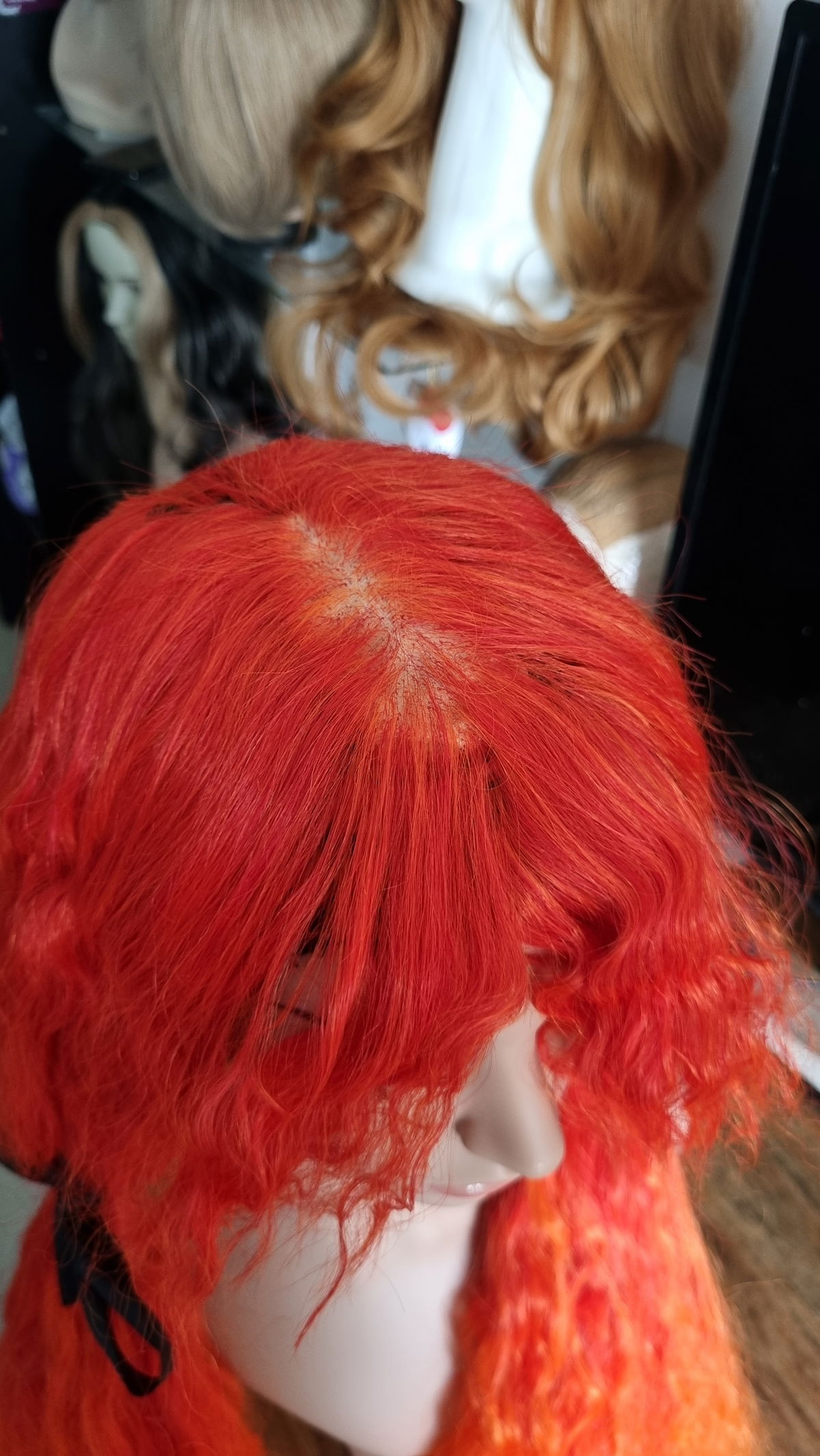- Fibra sintética kanekalon , tono naranja mix de rojos degrade a naranja claro.
