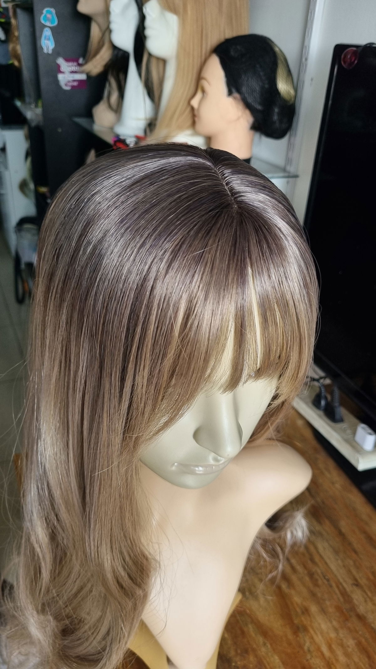 Fibra sintética kanekalon semi opaca , tono negro degrade rubio cenizo .