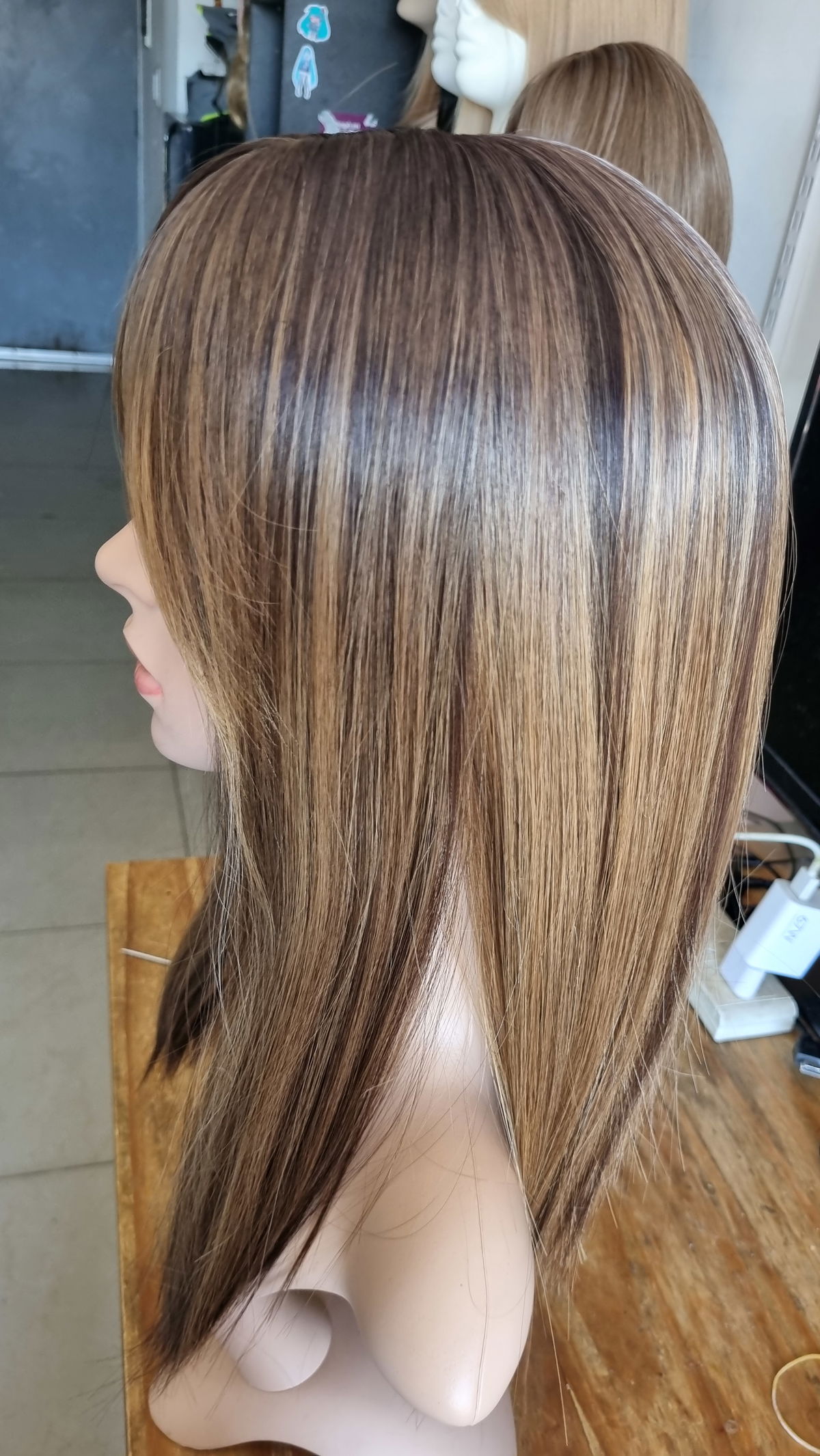 Fibra sintética kanekalon totalmente opaca , tono base castaño oscuro con reflejos en castaño claro.